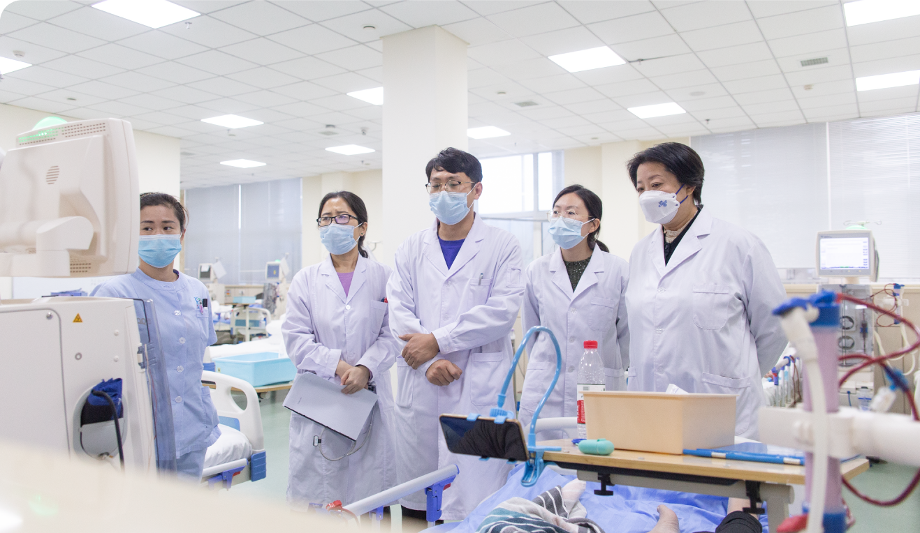 禹清集团始终以肾友为中心、以质量为核心,持续深化医疗质量内涵,组建了一支能级完善、权责清晰,具备精湛诊疗技术、高度责任意识与优良服务态度的医疗护理团队。其中,30%左右的医护人员从事肾脏病临床诊疗工作超过10年,具备三甲医院从业经验的医护占比高达60%。